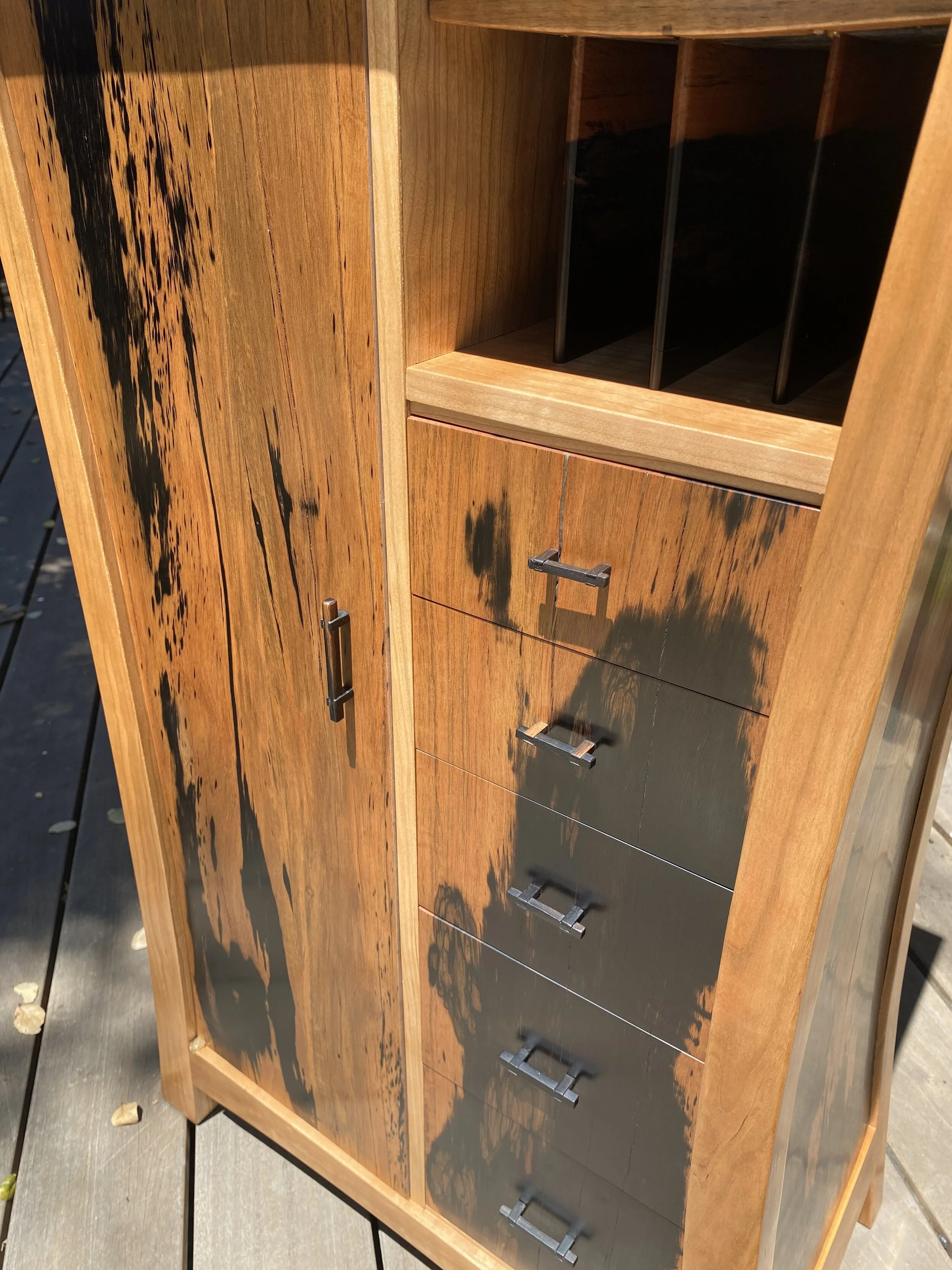 This Arts & Crafts sideboard was inspired by an article in the 1994 Winter edition of Home Furniture. Quartersawn white oak was common in the Arts & Crafts style. In keeping with Gustav Stickley’s approach to finishing, this was fumed with ammonia and then varnished. The secondary wood is poplar for the drawers and runners with ebony pins and pulls from Horton Brasses.